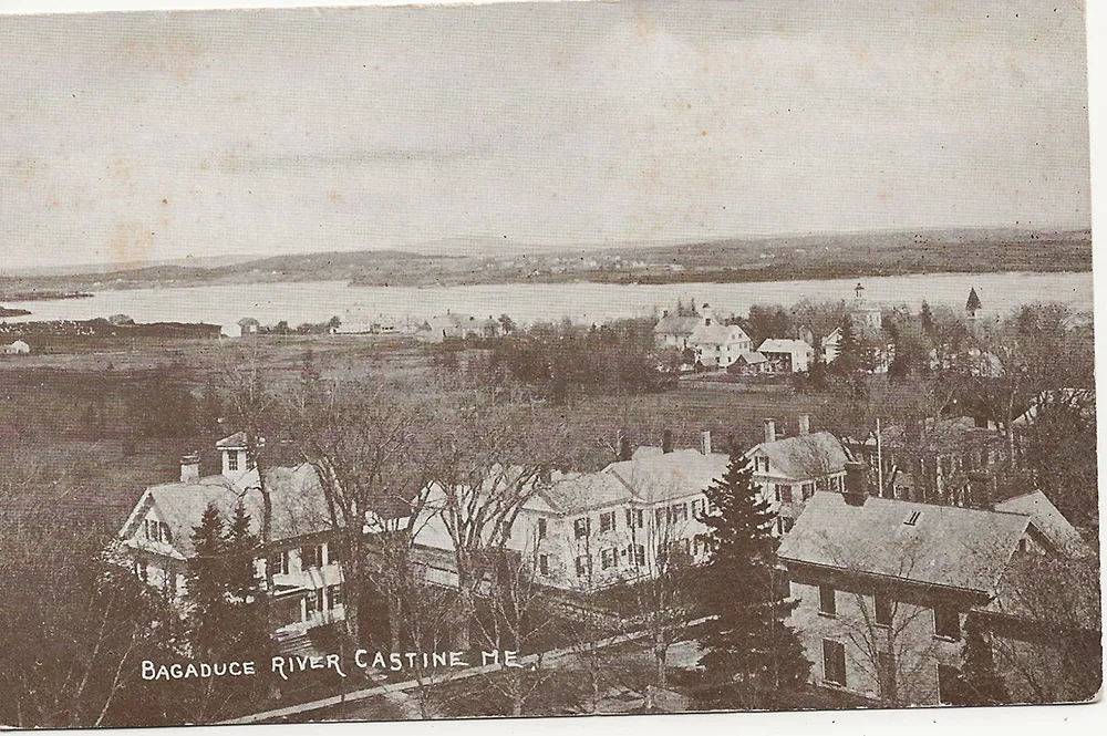 A view of several buildings in Castine, Maine with the Bagaduce River in the background.