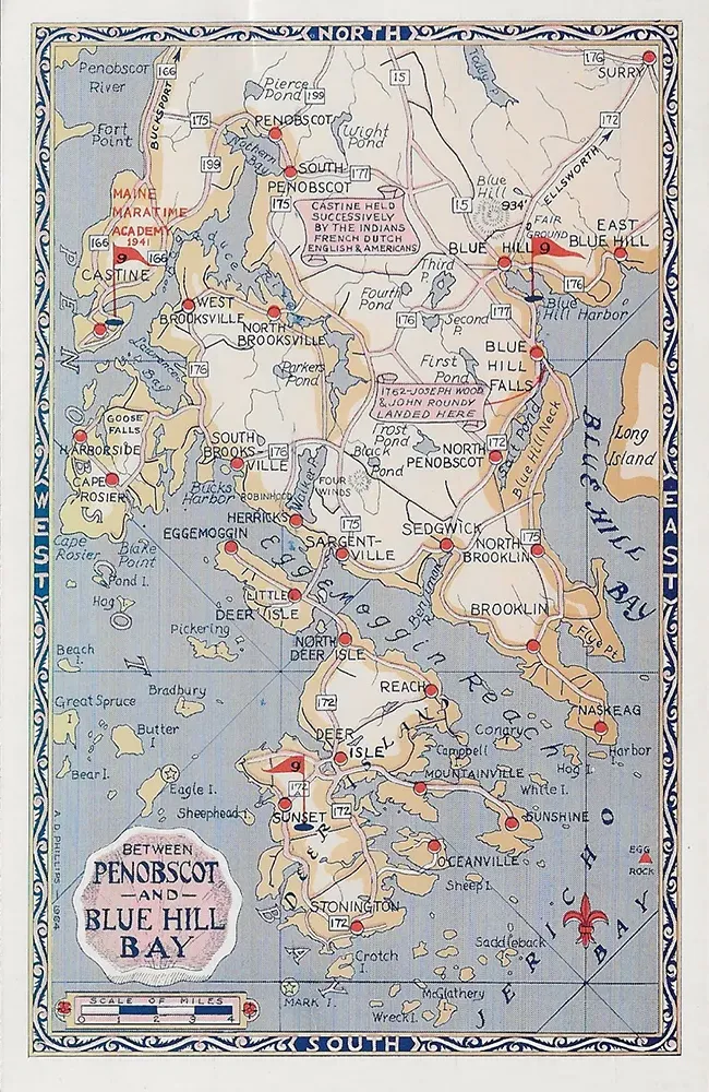 A map showing the location of towns on the Blue Hill Peninsula and some of the surrounding islands, Maine.
