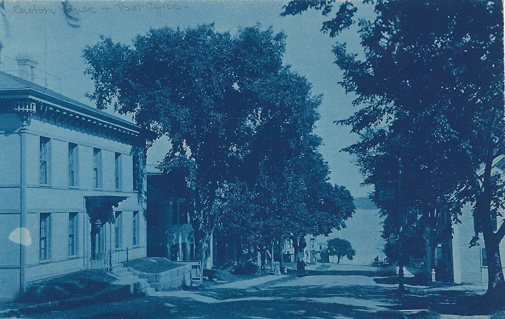 Post Office on Main Street, Castine, Maine. Blue tint postcard.