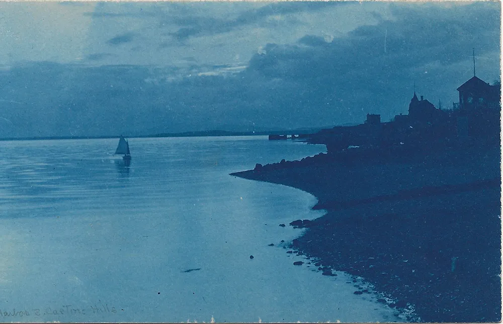 Harbor and Castine Hills, Castine, Maine. Blue tint postcard.