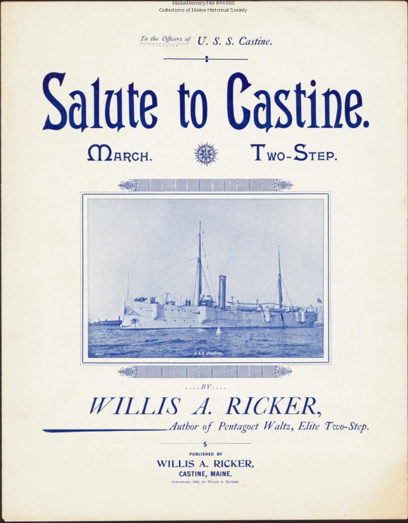 Willis Ricker (1873-1957) served on the board of selectmen in Castine and, in Augusta as a state representative and state senator. A graduate of the New England Conservatory, he ran a store in town, He played coronet in the Lawrence Town Band and wrote several pieces for the band as well as music for the piano including “Salute to Castine,’’ “Pentagoet Waltz’’ and “Elite Two-Step.’’ The front page of the sheet music for “Salute to Castine” bears the inscription “To the Officers of U. S. S. Castine.’’